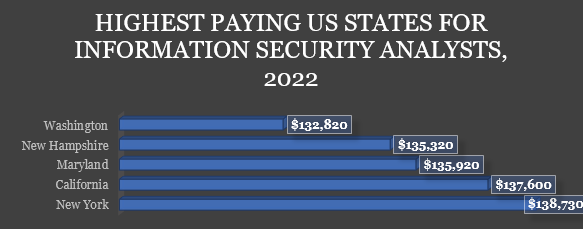 According to the US Bureau of Labor Statistics, they earned a mean annual salary of $119,860 in the US in 2022, while their annual mean salary in California was $137,600. Below is a list of the 5 highest paying states for Information Security Analysts in the US in 2022.